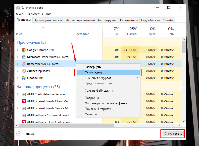 Ситуацию исправляет комбинация Ctrl+Alt+Del. Она открывает меню, где нужно выбрать «Диспетчер задач». После этого отобразится рабочий стол с открытым сервисным окном. В нем следует выделить запущенную игру и нажать «Снять задачу».